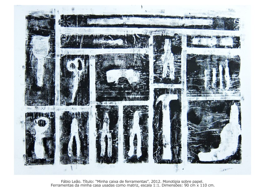 Fabio Leao Ferramentas Published 9 Março 2013 at 1769 × 1271 in Fabio Leao Ferramentas FÁBIO LEÃO “Minha caixa de ferramentas II”, monotipia sobre papel, ferramentas da minha casa usadas como matriz, escala 1:1, 90cm x 110cm, 2012, R$3.000 Compartilhe: Email a link to a friend (Abre numa nova janela) E-mail Tweet Share on WhatsApp (Abre numa nova janela) WhatsApp Gosto Carregando...