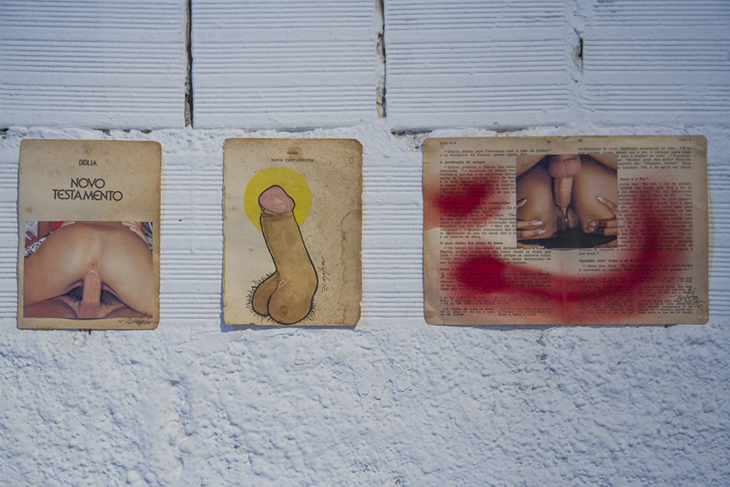 NIVALDO GONÇALVES ST, série Sanctíssimos Orgasmos 2016, colagem s/ Biblia Sagrada, 17,5 x 13 cm, de ST, série Subversão da Palavra 2012, Nanquim e aquarela s/ Biblia Sagrada, 17,5 x 13 ST, série Subversão da Palavra 2012, Nanquim e aquarela s/ Biblia Sagrada 15,5 x 26cm, R$300, (cada)