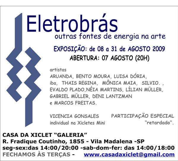 Eletrobrás – Outras Fontes de Energia é mostra de artistas e projetos não selecionados em salões e concursos de artes em 2009, entre eles BENTO MOURA, ARUANDA, LUISA DÓRIA, IBA, THAIS REGINA, MÔNICA MAIA, SILVIO, EVALDO PLADO, NÉIA MARTINS, LÍLIAN MÜLLER, GABRIEL MÜLLER, DENI LANTZMAN E MARCOS FREITAS.Individual na Xicletes Mini VICENCIA GONSALES. Rua Fradique Coutinho, 1855 – Vila Madalena –SP