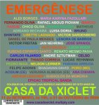 Emergênese – Momento Crítico e Fortuíto, reuniu artistas jovens vinculados com a experiência de convívio e participação do espaço. A programação também conta com encontros com convidados, chamados “COLÓQUE-OS”, em setembro e outubro, e oficinas culturais, em outubro. Os participantes da mostra forão: ALEX BORGES (IN MEMORIAN), MARIA KARYNA FAZZOLARI, RAFAEL ABOUD PIOVANI “PAJÉ”, LUISA DÓRIA, VICTOR SARDENBERG, BRUNO SHINTATE, MATHEUS, JAN NEHRING, VICTÓRIA COSTA, ANDRÉ SZTUTMAN, THIAGO CORREIA, LUCAS REHNMAN, FABIANA ARRUDA, FELIPE ADONIS, BHAGAVAN DAVID, PEDRO MAIA, RENATO MESMO PAIVA, DANIEL DE PAULA MENDES, O PORO (MG), ACIDUM (CE) E VERUSKA ALMEIDA (ES) Rua Fradique Coutinho, 1855 – Vila Madalena –SP