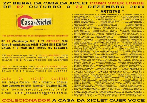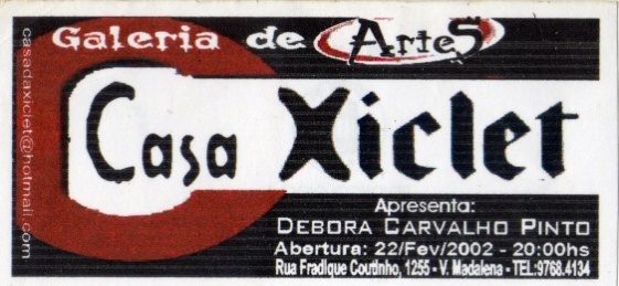 10 ANOS SEM VITÓRIA – O FRACASSO NUNCA ME SUBIU A CABEÇA (a frase é do Pereio mas o fracasso é da Xiclet) . Fundada em 2001, a Casa da Xiclet apresenta (a casa não-representa, só apresenta), a partir de 11 de setembro e em três edições artistas que passaram pela casa ao longo destes 10 anos. Artistas da VELHA-GUARDA como: FABIANA ARRUDA, MATHEUS JOSÉ DA COSTA, JAILTÃO, LEOPOLDO TAUFFENBACH, ADRIANA LATORRE, MARCIO VILLAR, NANÁ SPOGIS, PATRÍCIA POSSA, PRISCILLA BUSCHINELLI E LUCIANO CARDOSO. Artistas da NOVA-GUARDA como AMANDA MEI, DÁCIO BICUDO, FLAMBART DOLLYMAN, GEDLEY BELCHIOR BRAGA, GIBA GOMES, IRIS WAACK, KHALIL CHARIF, LUISA EDITORE, MARCEL FERNANDES, MARCELA TIBONI, MARCELO MORAES, MAZZILLI, MARCOS FREITAS, ROSSANNA JARDIM, TANIA NITRINI, VERUSKA ALMEIDA, VITOR MIZAEL E YARA DEWACHTER. Artistas da RETAGUARDA como ANDRÉ ALBUQUERQUE, ANDRÉ SZTUTMAN, DANIEL DE PAULA, DENI PISCIOTTA LANTZMAN, ENRICO LIMA, GABRIEL MULLER BARBOSA, JAN DE MARIA NEHRING, LUISA DÓRIA, LUCAS SCHLOSINSKI, LUANA SAGGIORO, LUCIANO ROCHA, RAFAEL ABOUD PIOVANI e AMARAL FALCÃO. Artistas da JOVEM-GUARDA como CACO LERNER, CHICO OLIVA, DANIEL BIROLLI, DENI PISCIOTTA LANTZMAN, FERNANDO MEYER O “XINA”, FELIPE BLANCO, GABRIEL MULLER BARBOSA, JEESSE FERREIRA FARIAS JUNIOR, RAFAEL GATUZZO BARBIERI E TARIK JUAN KLEIN. Artistas do ALÉM-GUARDA (do exterior) ISAC ENRIQUEZ ( Chicago, EUA) e GENTA HIGASHI ( Tokio, Japão) e a RETARDADA XICLET .