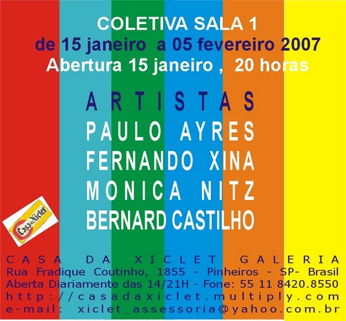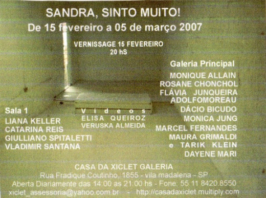 Coletiva I BIENAL MERcuSUL/SP – Artistas: ANIA VALLE(SULDE CUBA), SILVESTRE ( SUL DE CUBA), ROXXANE CHOCNHOL ( SUL RJ), WAGNER PINTO (SUL DO SUL), JOÃO EULÉLIO KAAARAH ( SUL DE BRASÍLIA), MONIQUE ALLAIN ( SUL DO CHILE), ANDREA POSHAR ( SUL DA PB), PAULO FALCÃO ( SUL DE SP), FABIANA ARRUDA ( SUL DE RINÓPOLIS), ANDRÉ SZTUTMAN( SUL DE SP), LUISA DÓRIA ( SUL DE SP), YARA DEWACHTER ( SUL DE SP), MIRIAN DE LOS ANGELES (SUL DE SP), GLÓRIA SEDDON ( SUL DO RJ), FLAMBART DOLLYMAN( SUL DO RJ).