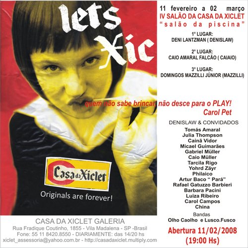 O evento A Casa da Xiclet Não É Underground, É Playground! É um Ambiente Caseiro Onde se Pode Vivenciar o Lazer Cultural… Quem Não Sabe Brincar Não Desce para o Play tem nome e programação quilométricos e apresentou na mostra “Playground” obras que têm ligação com jogos e brincadeiras infantis que contou com a participação dos artistas PR TAYPA, CHARUAN, CMS, LUIZA MOURA, GRUPO ACIDUM , ANDRÉ SCHNECK, BIBA RIGO, GABRIEL “MOISÉS” MULLER, FABIO CELASSIS, MARCOS FREITAS, CASSIANO REIS, FREDERICO FILIPPI, CELESTE PANCERA, SARAH GROTHUS, TIAGO SPINA, FEUP, XICLET, ANDRÉ SZTUTMAN, LUISA DÓRIA, NELSON LEIRNER, FERNANDO RIBEIRO, CAIO FALCÃO, PILAR BOSIA, ADRIANA LATORRE, FABIANA ARRUDA, IGOR STEVANOVIC, VICTOR FREITAS, MARCIO RAMOS, CAINÃ VIDOR, CHICO & BENTO, ASTRID ESSLINGER, JAN NEHRING E XU. AINDA FORAM MOSTRADOS GRAFFITIS DE CHARUAN REIS, CELESTE PANCERA, BEATRIZ YURI, MARCEL J. SUGAI, JACK BROWN, DANIEL ZACK, RALF E NATURAL. Lançamento do projeto “CAMPING ARTÍSTICO” ..Rua Fradique Coutinho, 1855, Vila Madalena –SP