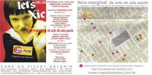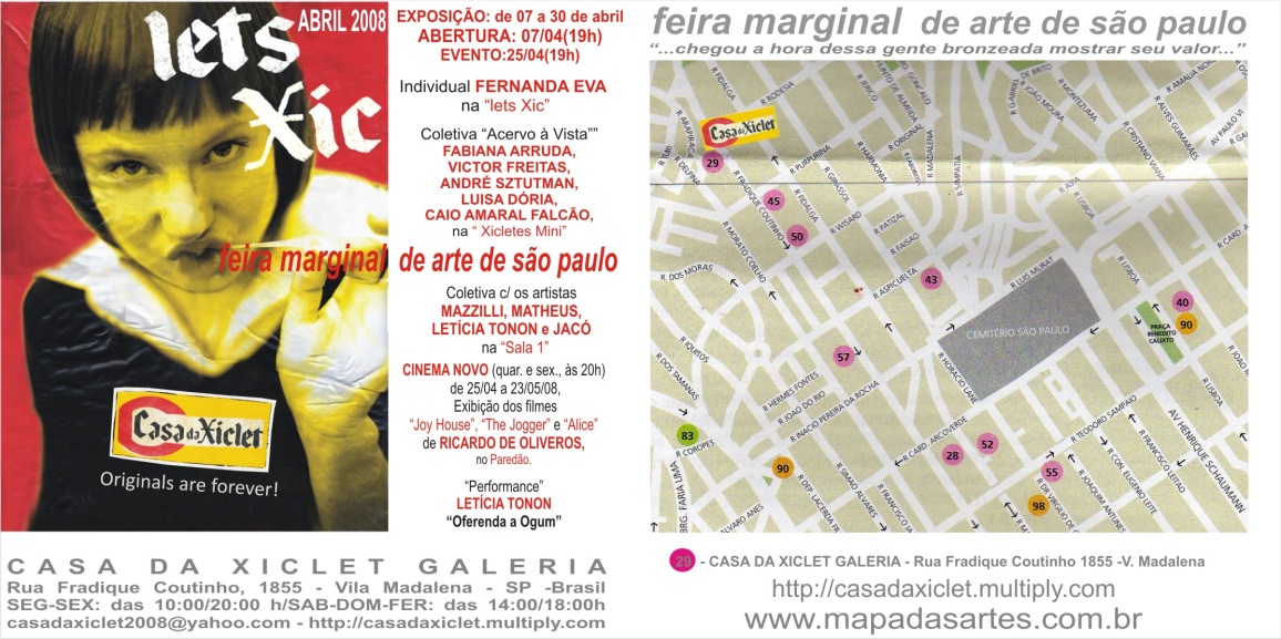 Feira Marginal – Seja Marginal, Seja Vertical traz mostra coletiva com obras de AFFONSO ABRAHÃO, ANDRÉ ALBUQUERQUE, BARTOLOMEO GELPI, CHRISTINA MEIRELLES, JAN NEHRING, JOÃO MACIEL, LUCAS REHNMAN, LUIZ MARTINS E RODRIGO MOGIZ. Exposições individuais de M. ABUCHALLA E FABIANA ARRUDA e outra coletiva com trabalhos de CAIO MARTINELLI, FREDERICO FILIPPI, FERNANDA EVA E VICENCIA GONSALES. Stand By Casa da Xiclet SP / 2010 reúniu obras de ANDRÉ SZTUTMAN, ASTRID ESSLINGER, FABIANA ARRUDA, SILVIO P., RAFAEL ABOUD PIOVANI, JAILTÃO, GEDLEY BRAGA, JP ACCACIO, MARCIO RAMOS, MARCELA TIBONI, AMANDA MEI, MONICA NITZ E ROXXANE CHONCHOL. O grafiteiro CMS abre sua “barraquinha” de obras na lavanderia da casa..Rua Fradique Coutinho, 1855, Vila Madalena –SP