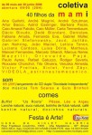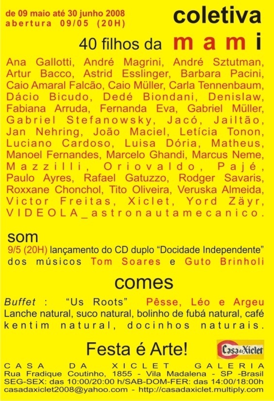 Coletiva mami:coletiva c/ os artistas: ANA GALLOTTI, ANDRÉ MAGRINI, ANDRÉ SZTUTMAN, ARTUR BACCO, ASTRID ESSLINGER, BARBARA PACINI, CAIO AMARAL FALCÃO, CAIO MÜLLER, CARLA TENNENBAUM, DÁCIO BICUDO, DENISLAW,FABIANA ARRUDA, FERNANDA EVA, GABRIEL MÜLLER, GABRIEL STEFANOWSKY, JACÓ, JAILTÃO, JAN NEHRING, JOÃO MACIEL, LETÍCIA TONON, LUISA DÓRIA, MATHEUS, MARCELO GHANDI, MAZZILLI, PAJÉ, PAULO AYRES, RAFAEL GATUZZO, ROXXANE CHONCHOL, VERUSKA ALMEIDA, VICTOR FREITAS, XICLET, MARCOS FREITAS E YORD ZÄYR.Individual do carioca MARCELO MORAES, na Xicletes MiniLançamento do CD duplo “Docidade Independente” dos músicos TOM SOARES E GUTO BRINHOLICOMES:Buffet : “Us Roots”: PÊSSE, LÉO E ARGEU. Rua Fradique Coutinho, 1855 – Vila Madalena –SP