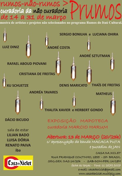 Rumos-Não-Rumos – Prumos – Curadoria da Não Curadoria, onde participaram os artistas: SERGIO BONILHA E LUCIANA OHIRA, ANDRÉA TAVARES, THALITA XAVIER E HERBERT GONDO, CRISTIANA DE FREITAS, LUIZ DINIZ, ANDRÉ COSTA, ANDRÉ SZTUTMAN, THAÏS DE FREITAS, DÁCIO BICUDO, RAFAEL ABOUD PIOVANI (PAJÉ), MATHEUS, XU SCHUETZE, VANESSA ESPÍNOLA E DENIS MARICATO.. Projeto “Mapoteca”, com desenhos e gravuras de diversos artistas da Casa, com curadoria de MARCIO HARUM. Seminário com artistas e curadores de 14 a 20/03/09. Simultaneamente exposição dos artistas IBA, RENATO PAIVA, LUISA DÓRIA E LILIAN BADO; desenhos de FABIANA ARRUDA; individual de DENIS MARICATO na salinha Xicletes Mini. Em 20/03/09, às 20h, performance de VANESSA ESPÍNOLA .Rua Fradique Coutinho, 1855 – Vila Madalena –SP