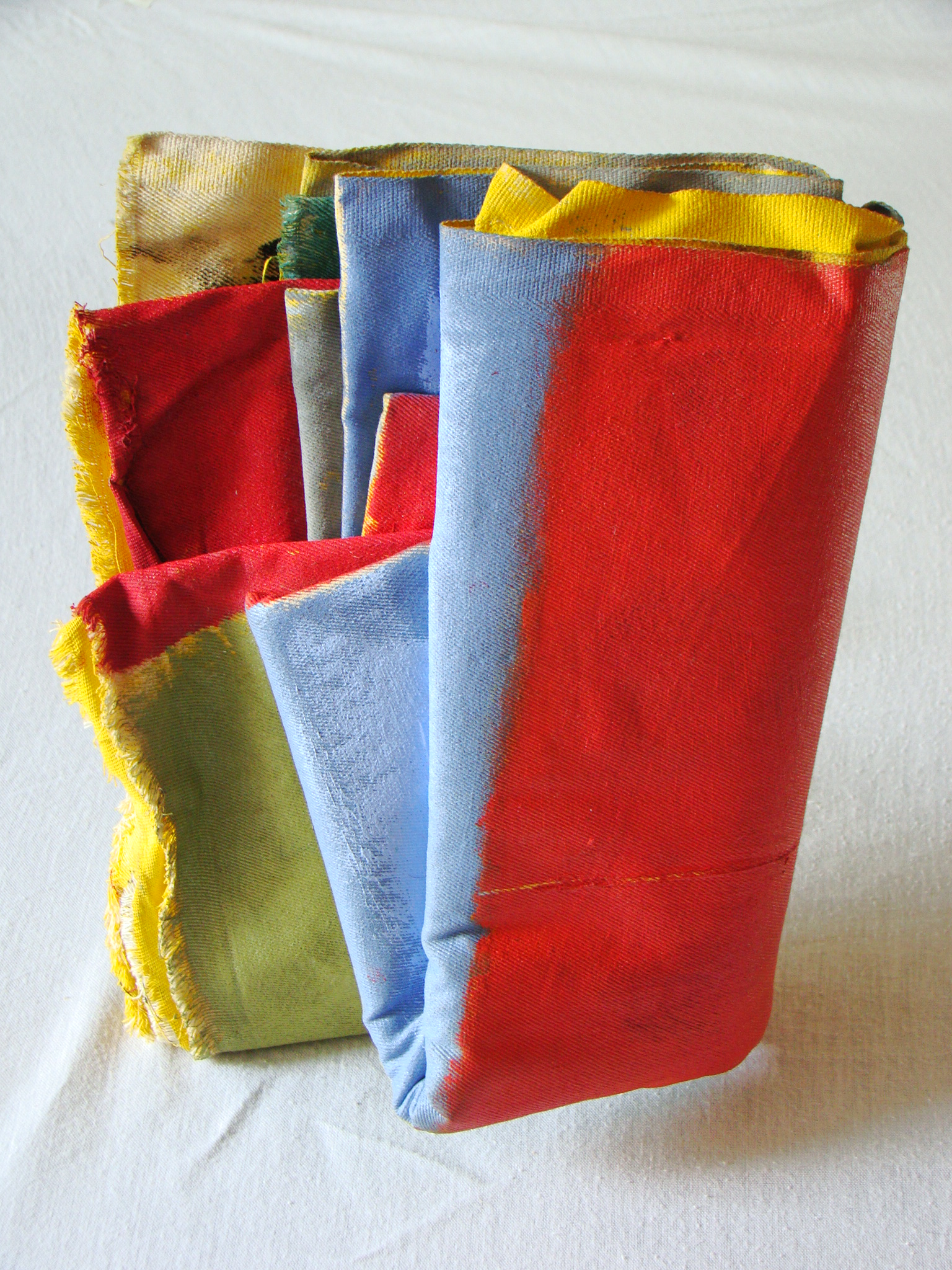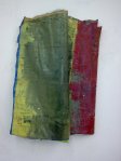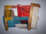 Aqui, o trabalho caminha de duas maneiras diferentes: uma opção é a de pintar a tela e dobrá-la sem que a tinta seque. Isso traz certas conseqüências para o trabalho. Primeiro, se o trabalho for re-aberto depois de finalizado (após a última camada de tinta que ficou por cima estiver seca) dependendo do tipo de tinta, e da mistura feita para obter as cores, a tinta aplicada dentro do trabalho pode ter secado ou não. Isso cria dois tipos de conseqüências. Se a tinta estiver seca, ao ser aberto, o trabalho oferecerá mais um tipo de resistência, porém, dessa vez, com o “ espectador” que o estiver abrindo. As partes grudadas, quando abertas, rasgarão e criaram formas e imagens que nem eu vi, formando um novo trabalho. Se a tinta não estiver seca, o trabalho oferecerá outro tipo de resistência ao “ espectador”, que será a de manejar a obra sem se sujar, ou “ danificá-la”. Os trabalhos construídos para serem abertos geralmente lidam com a espera da secagem da tinta para que assim, quando abertos, não grudem nem tenham a pintura produzida nela danificada ou modificada. Desta maneira o embate do espectador com o trabalho seria mais simples. Ele iria se defrontar apenas com um trabalho pronto. Ao possibilitar a abertura da tela, a obra sofre uma mudança muito significativa que é a de libertar, ou, contar para o espectador o que ela escondia. Nesse momento a tensão ( zona de risco) que ele possuía (a dobra e o esconder uma ou mais pinturas) é desfeita e o trabalho perde força. Geralmente, os trabalhos feitos com a tinta ainda molhada são produzidos para que permaneçam fechados. Desse modo, seriam expostos na parede, como uma pintura tradicional, não possibilitando ao espectador mexê-los. O trabalho contém um elemento muito forte, que é a ação de esconder a pintura produzida. A ação de dobrar a tela com uma pintura dentro não acaba após a dobra ser feita, ela se permeia e continua, a partir do momento em que o espectador se defronta com o trabalho e não tem a possibilidade de ver o que existe dentro dele. Essa ação- momento dá ao espectador muitas obras diferentes; a primeira é a pintura-objeto em si que, com todas as dobras e camadas de tinta ganha um novo corpo onde se ve massa, peso, volume, a ação de dobrar e a ação de resistência constante da tela, somado aos elementos de cor que são mostrados nas bordas de cada dobra. A segunda é a obra que o espectador tem a possibilidade de construir em sua mente ao se deparar com um trabalho que ele não vê. Ele passa a imaginar, ou tentar conceber o trabalho em sua mente. Voltando à discussão iniciada no inicio do texto, o suporte, neste caso, é o trabalho e o trabalho é o suporte. Não à divisão entre um e o outro. Isso traz a tona todas as discussões iniciadas pelos expressionistas abstratos na década de 50 e evidencia uma mobilidade e um desdobramento de opções para a pintura contemporânea.